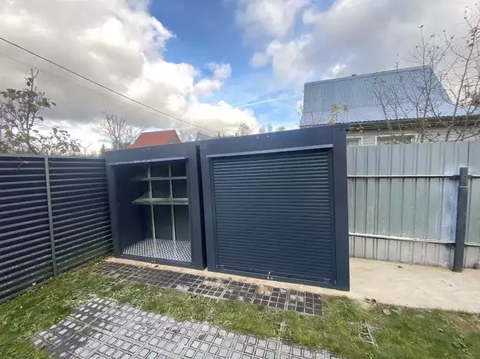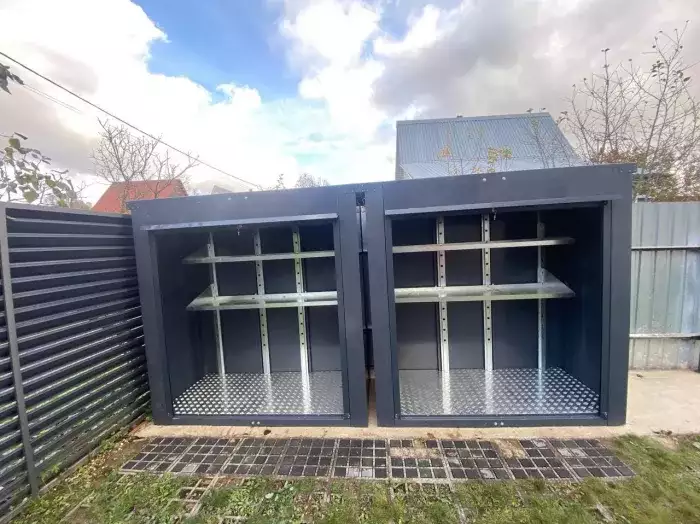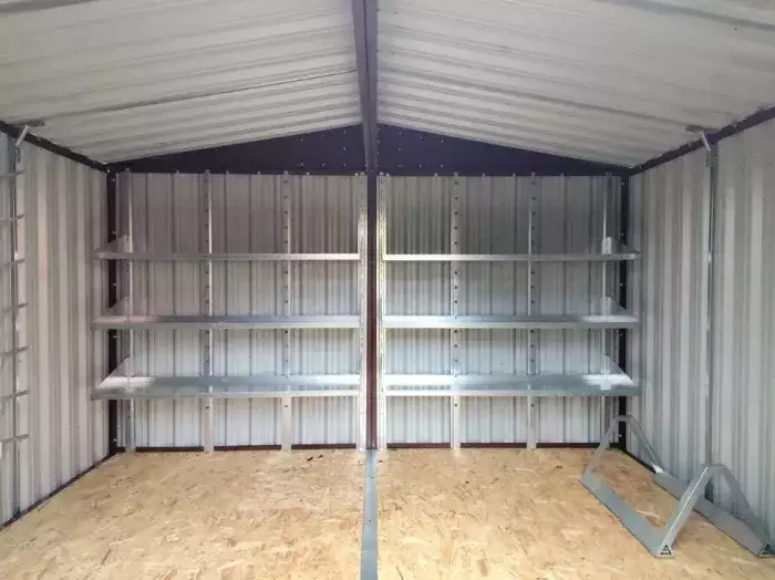 Дополнительно хозблок оборудован прямым стеллажом с двумя полками, выполненными в цинковом цвете, бе окрашивания.