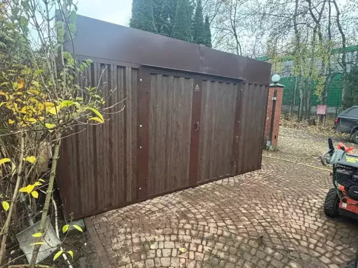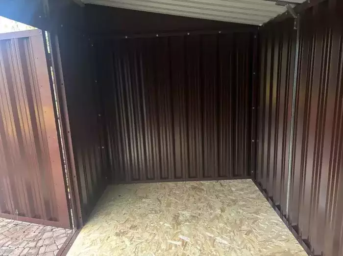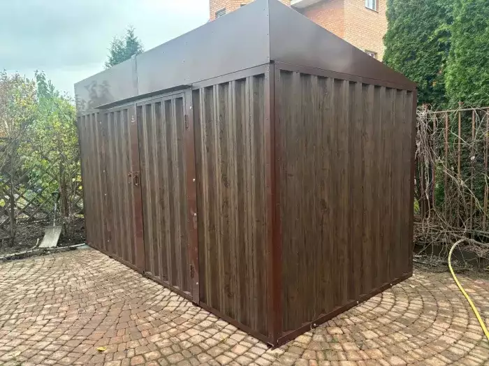 Проект: 6-метровый хозблок для хранения газонокосилки, садового инвентаря и хозяйственных принадлежностей в расцветке "под дерево".
