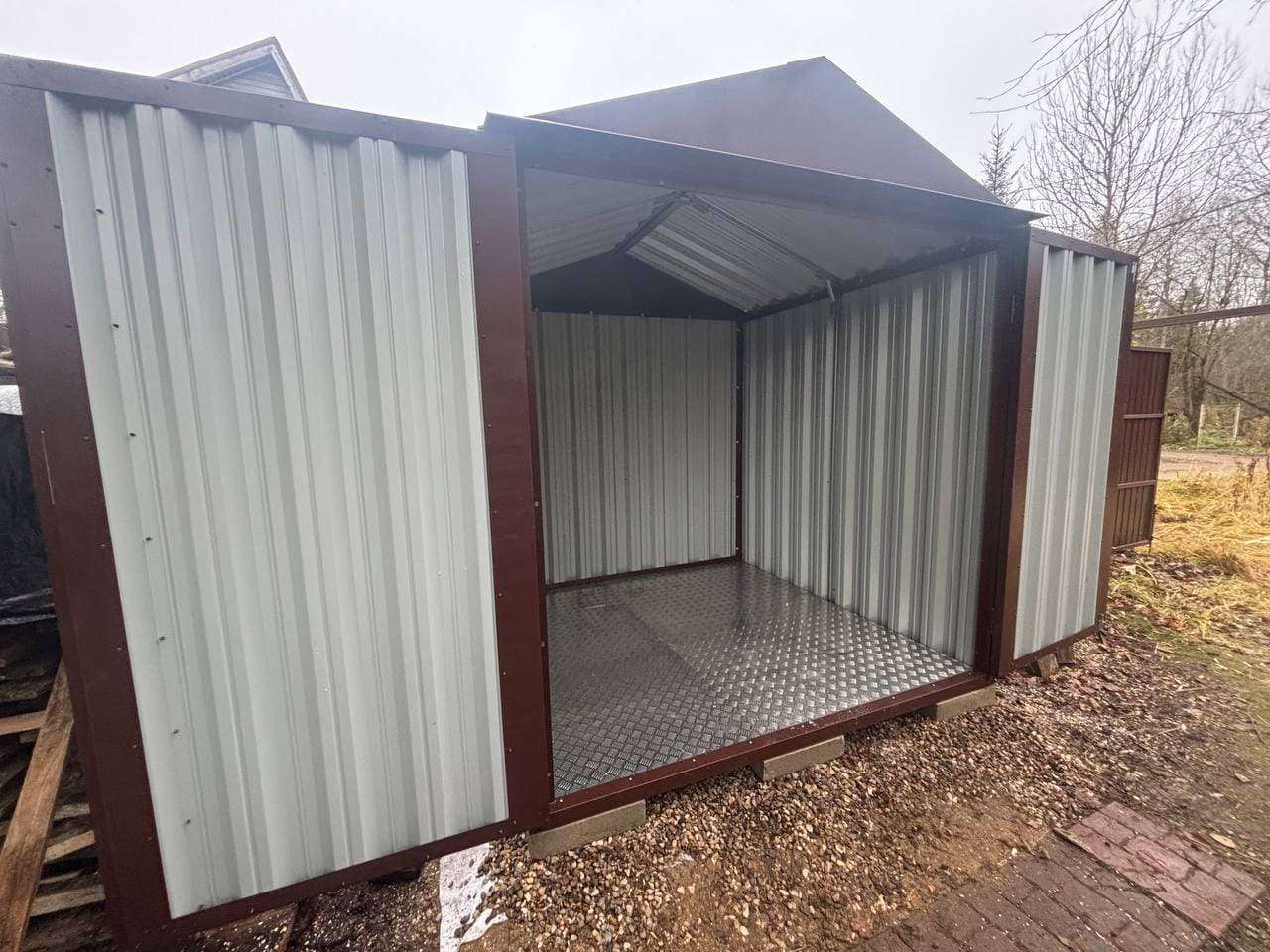 Нами была изготовлена стандартная 2-метровая конструкция с двускатной крышей и торцевой воротной группой в популярном шоколадно-коричневом цвете RAL 8017.