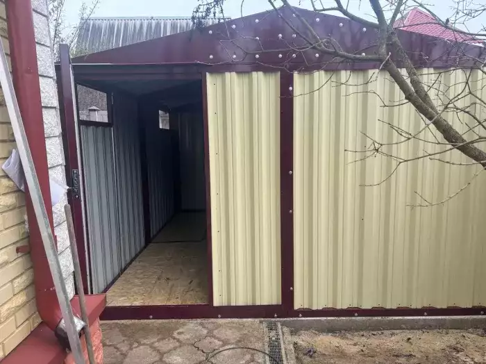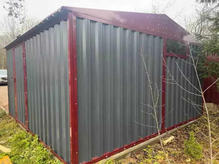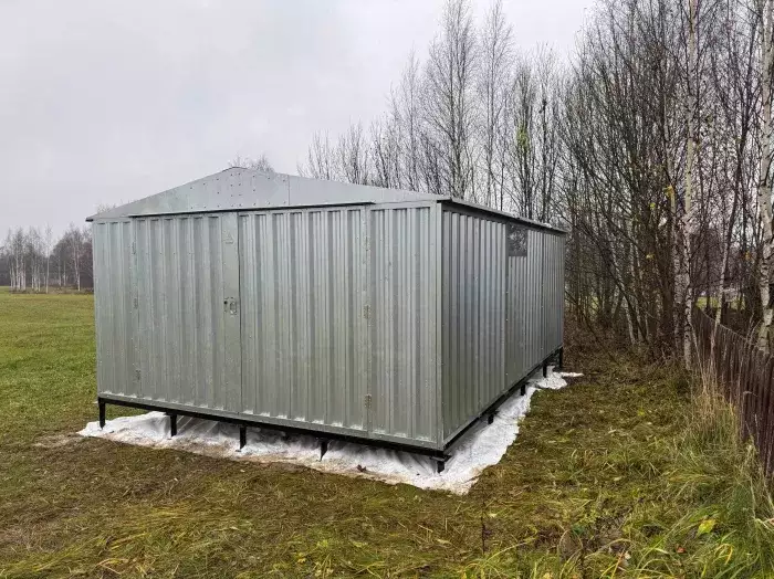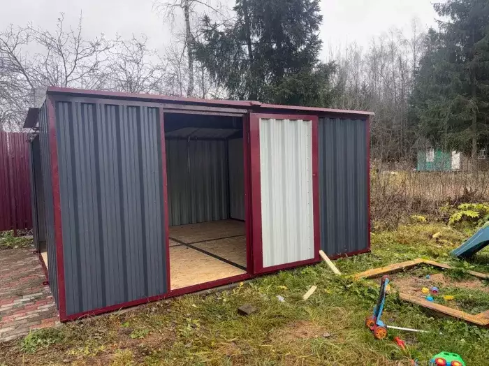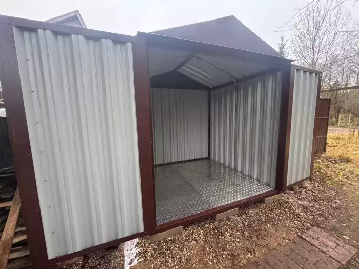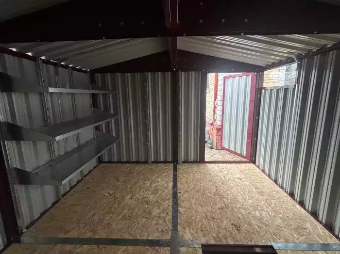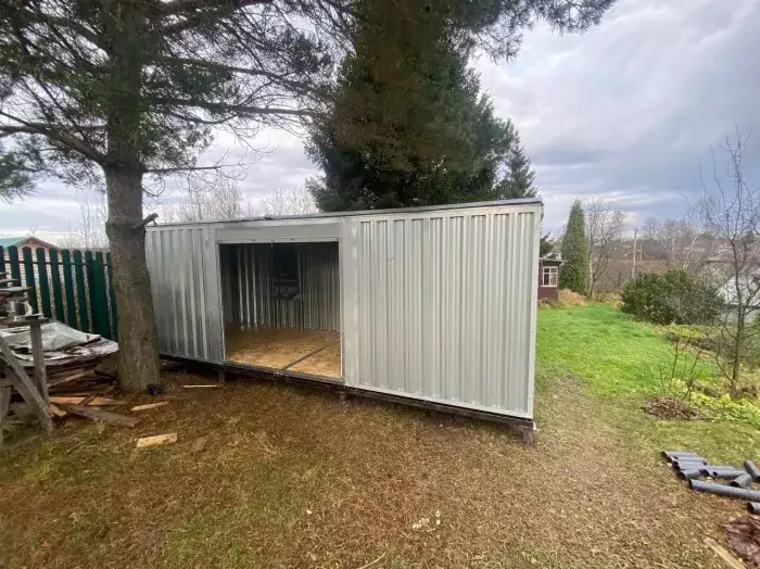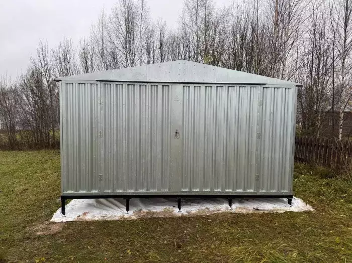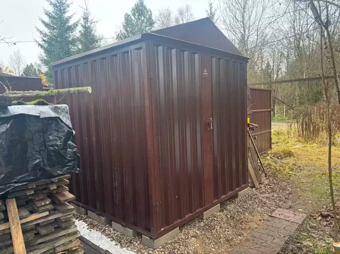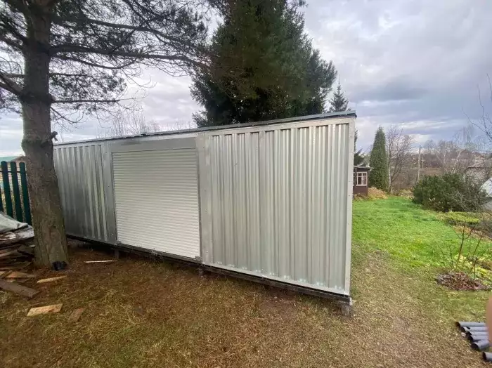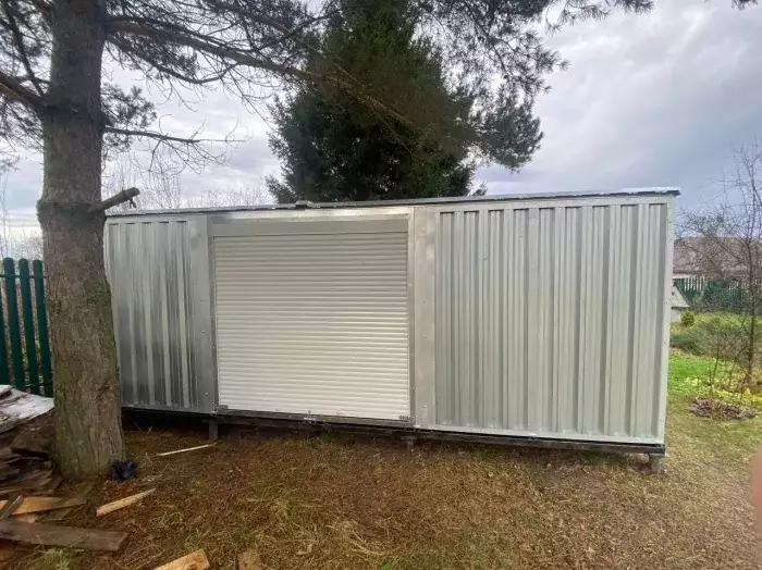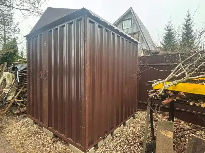 Нами была изготовлена 4-метровая конструкция с односкатной крышей и торцевой воротной группой в блестящем цинковом цвете. Дополнительно хозблок оборудовали антивандальным засовом. Теперь у злоумышленников нет шансов:)