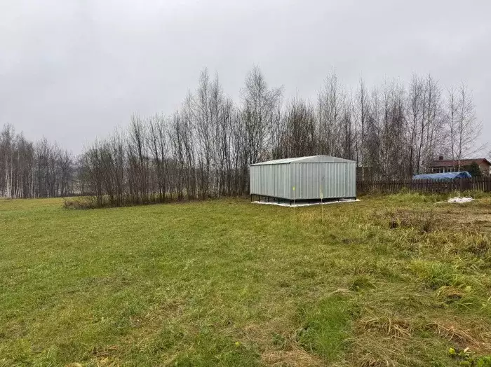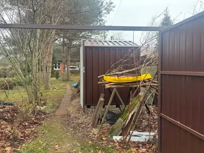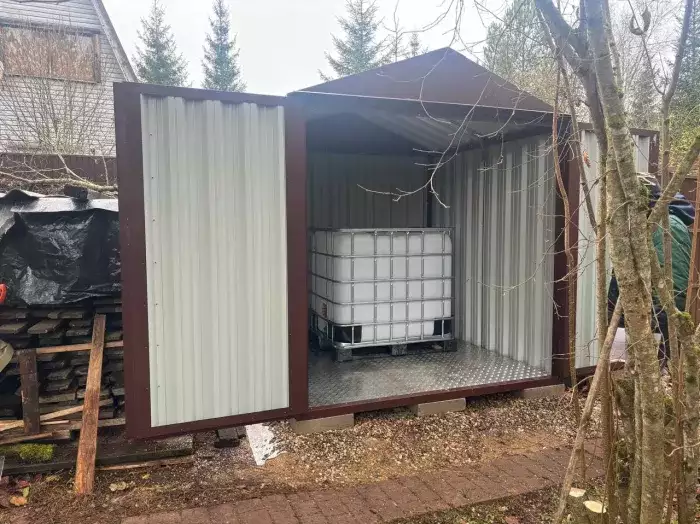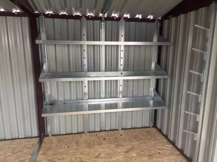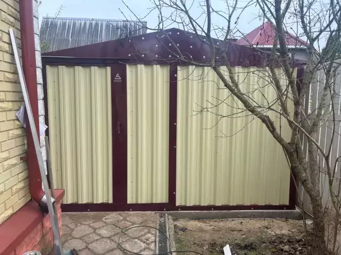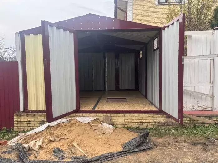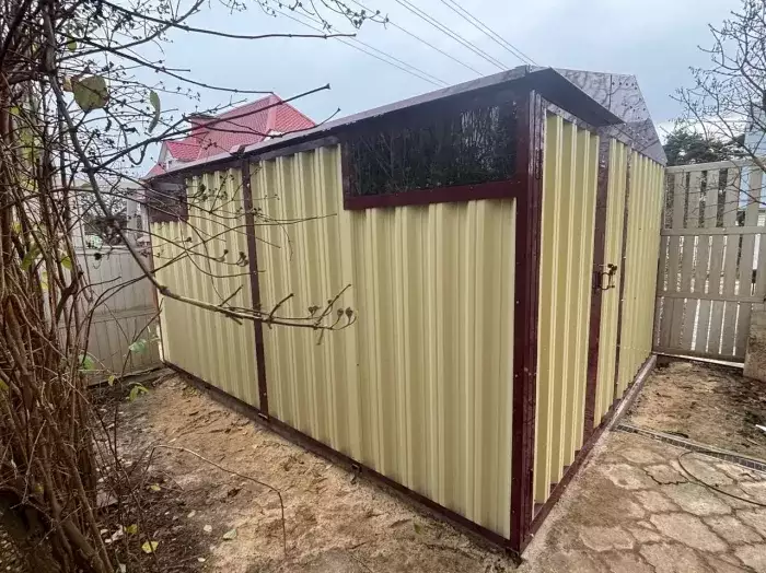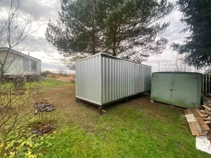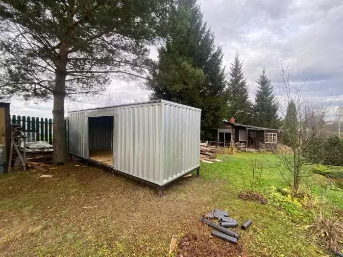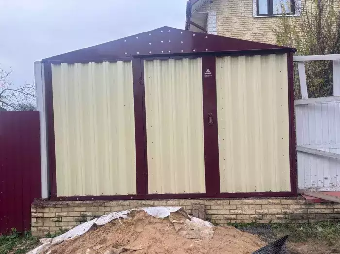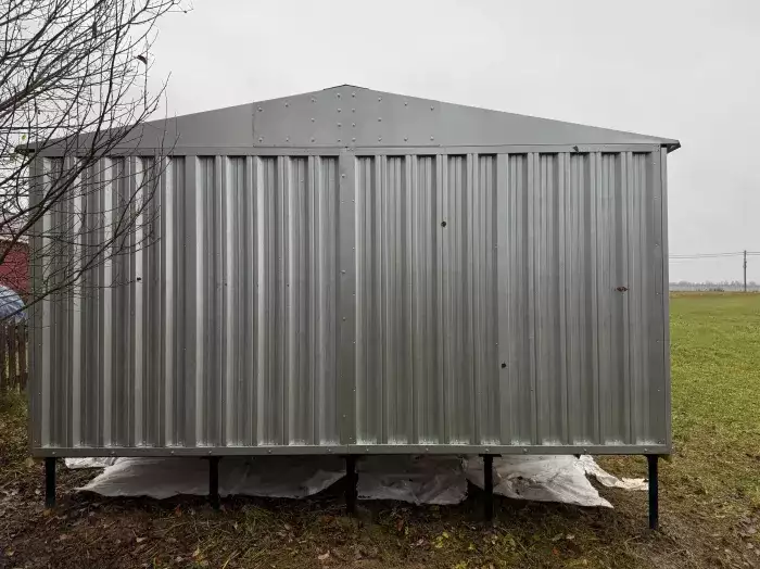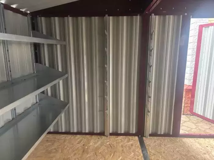 Нами была изготовлена 4-метровая конструкция с односкатной крышей и торцевой воротной группой в блестящем цинковом цвете. Дополнительно хозблок оборудовали антивандальным засовом. Теперь у злоумышленников нет шансов:)