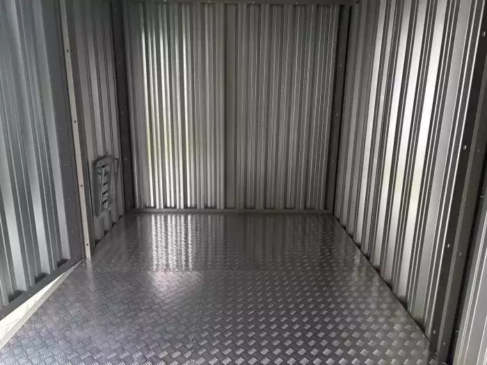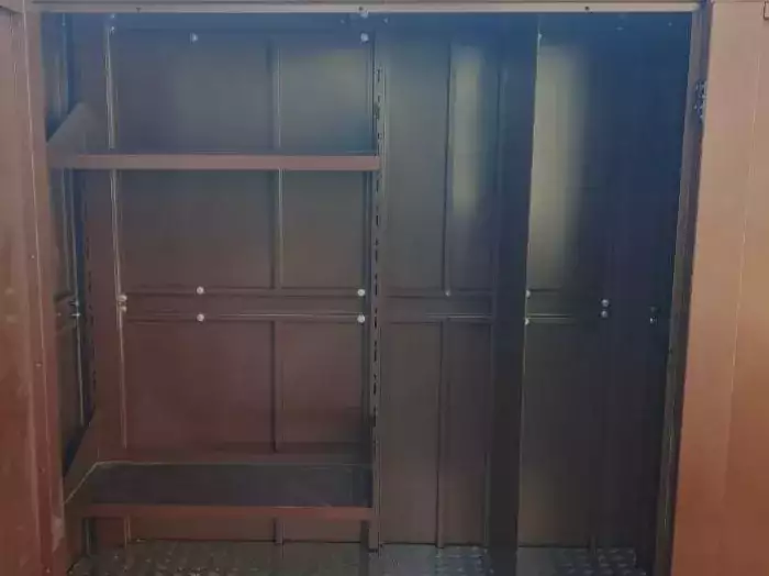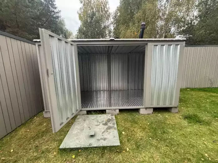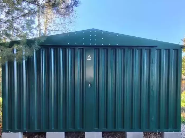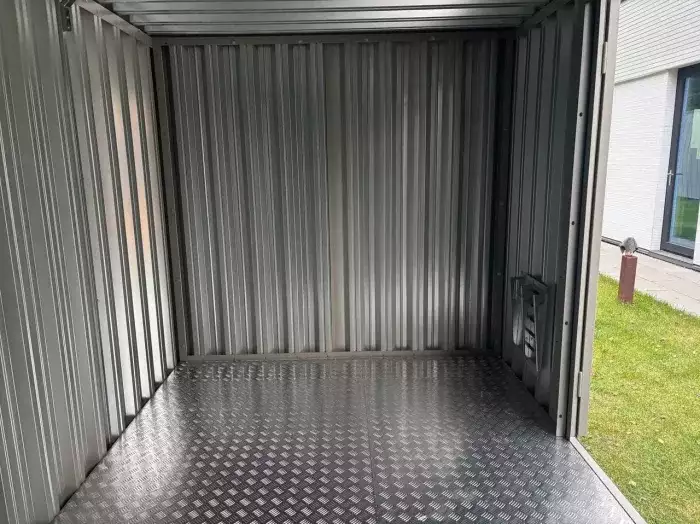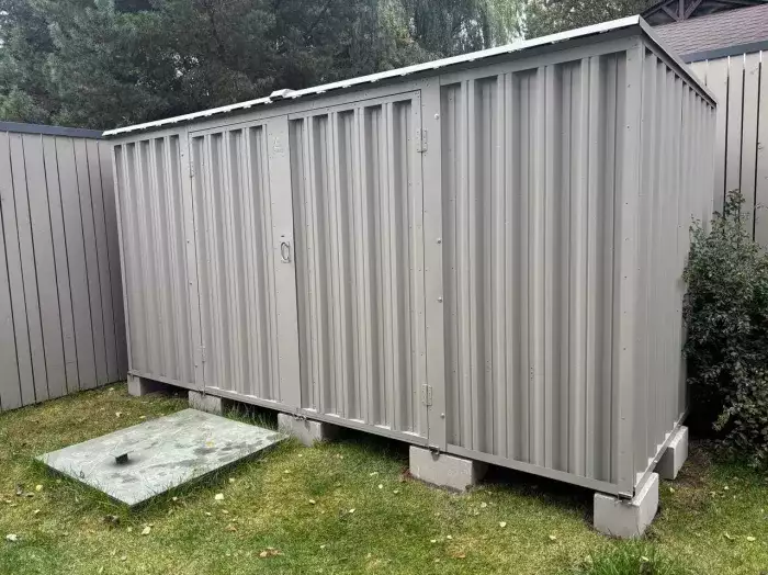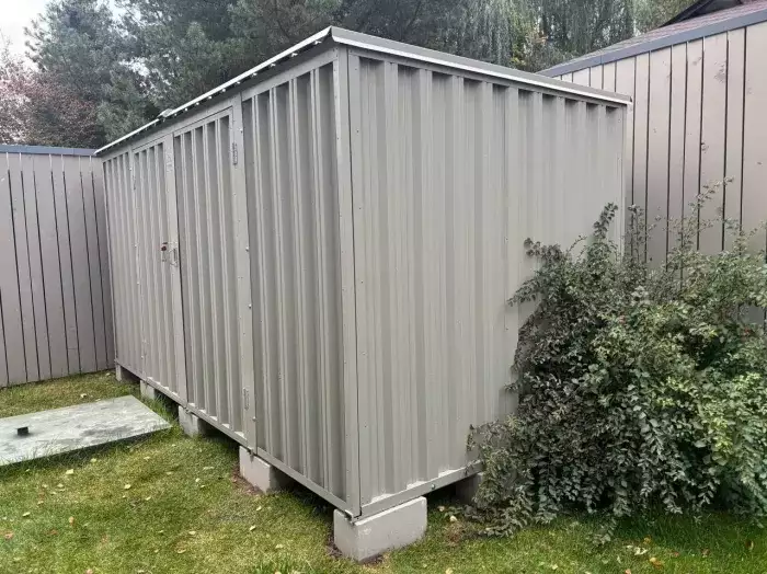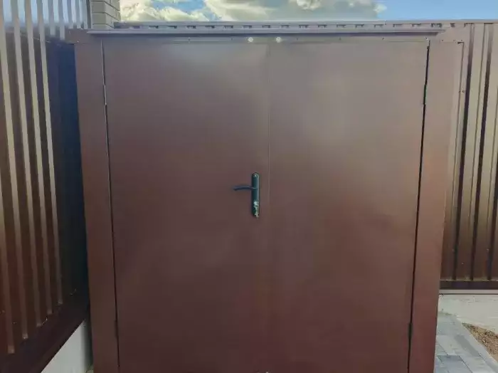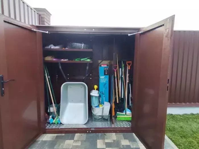 Проект: 4-метровый хозблок для хранения инвентаря в серо-коричневом цвете.