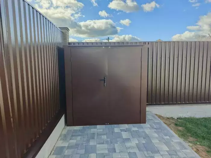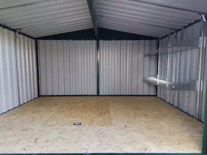 Нами была изготовлена стандартная 4-метровая конструкция с двускатной крышей и торцевой воротной группой в благородном серо-коричневом цвете RAL 8019.