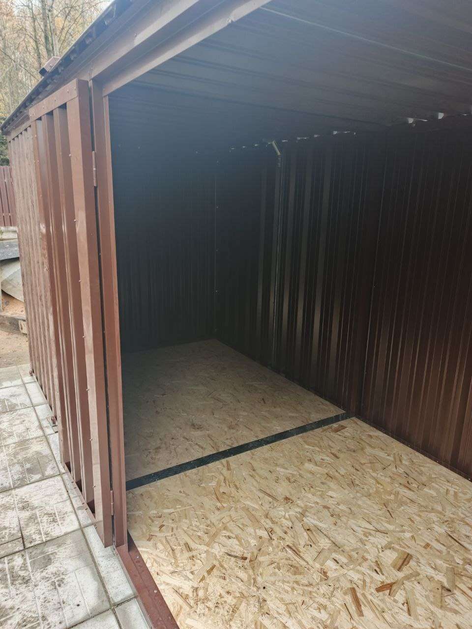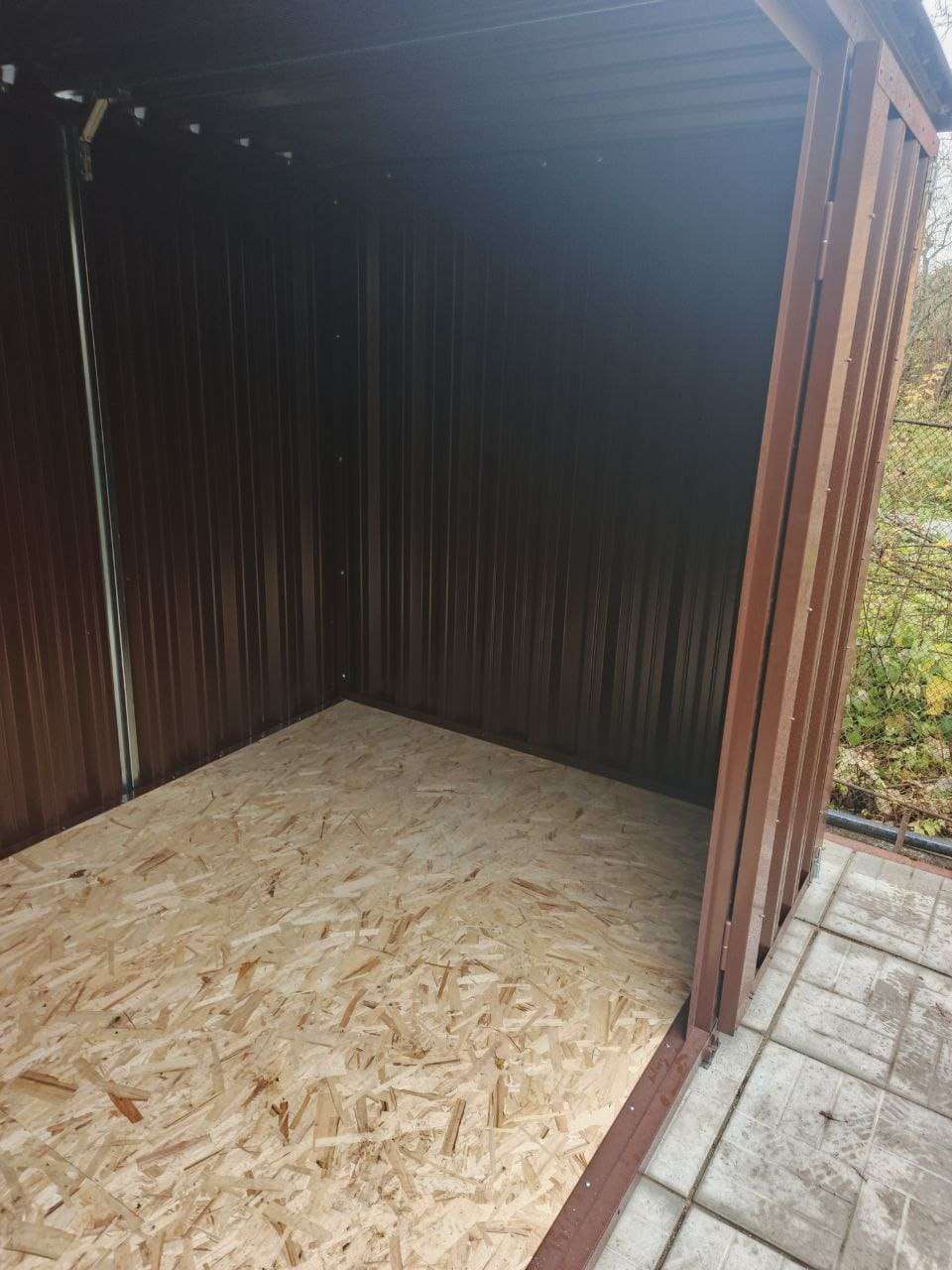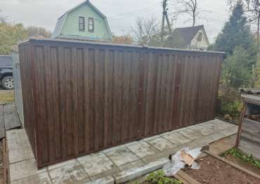 Нами была изготовлена конструкция размером 5 х 1,97 м с плоской крышей и боковой воротной группой в комбинации расцветок «под дерево» Темный дуб для основных элементов и шоколадно-коричневого RAL 8017 для фасонных элементов и крыши.
