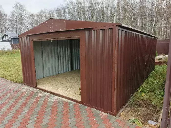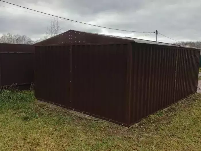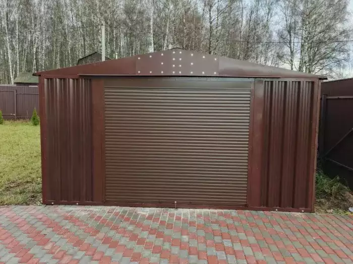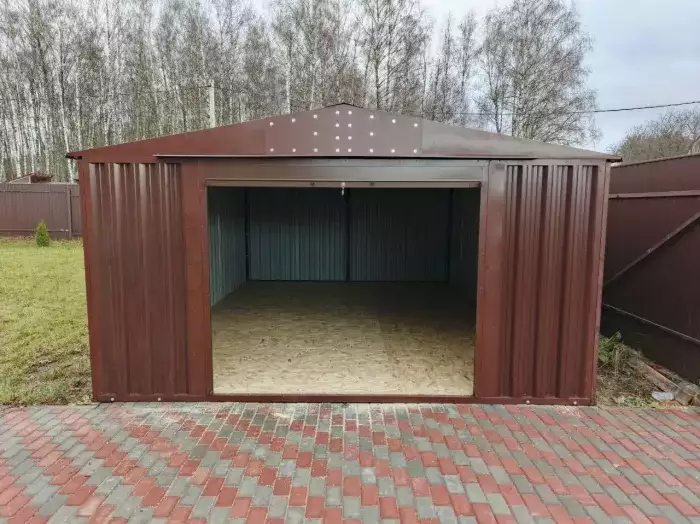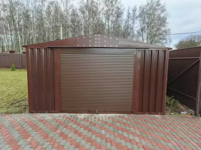 Нами была изготовлена стандартная 6-метровая конструкция с односкатной крышей и боковой воротной группой в благородном серо-коричневом цвете RAL 8019.