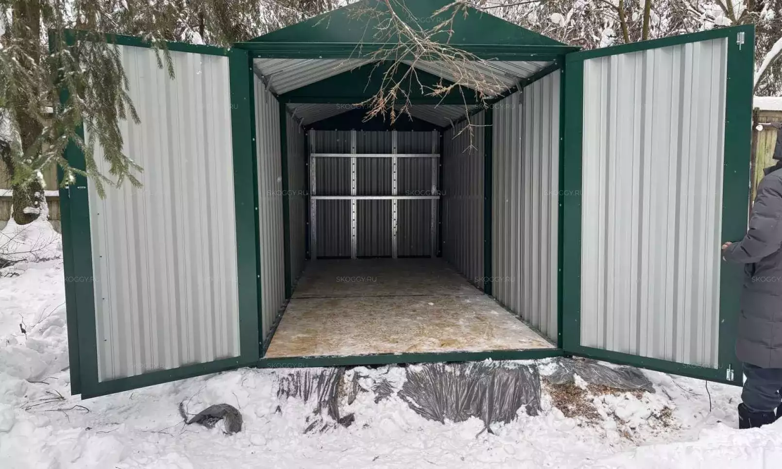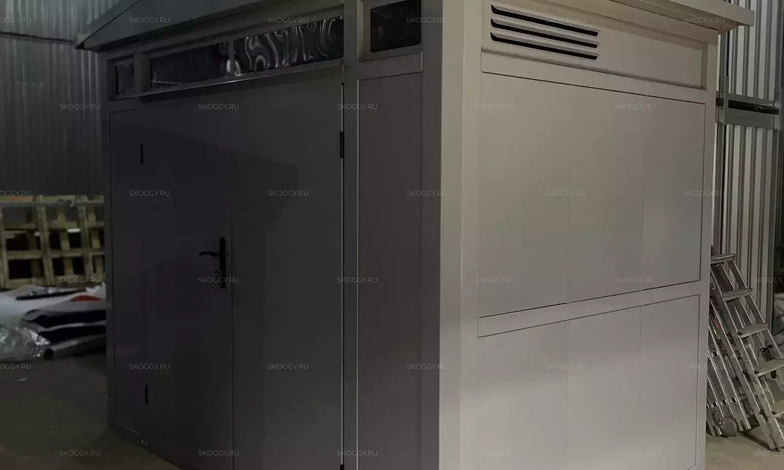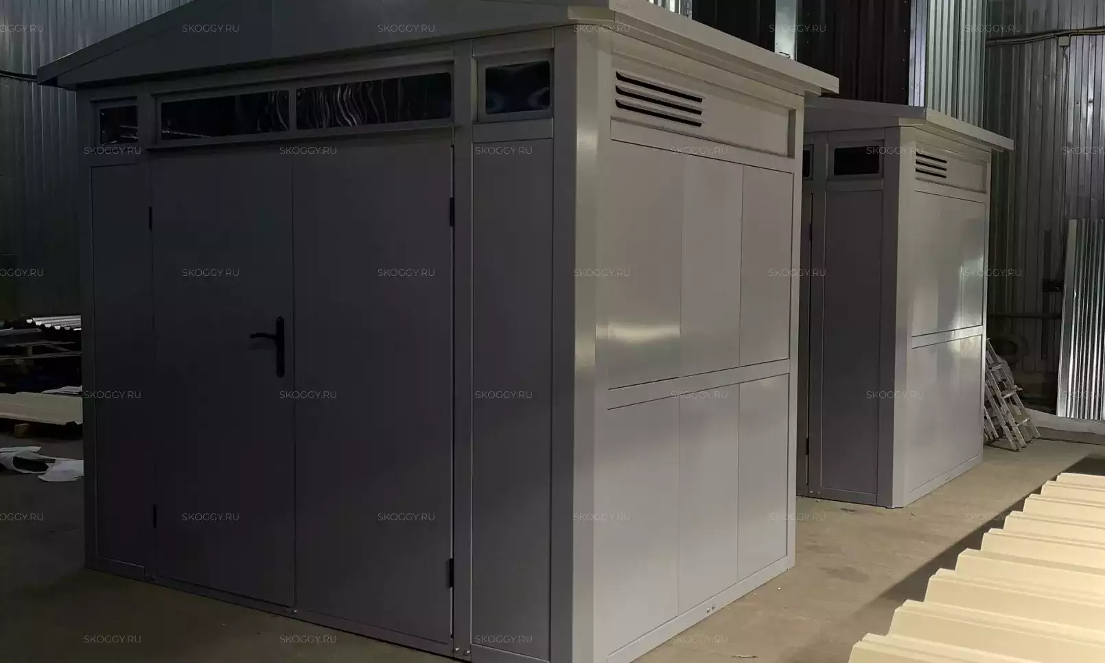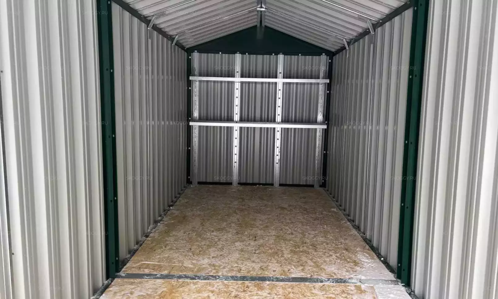 Нами была изготовлена стандартная 4-метровая конструкция с плоской крышей и торцевой воротной группой в неизменно популярном шоколадно-коричневом цвете RAL 8017.