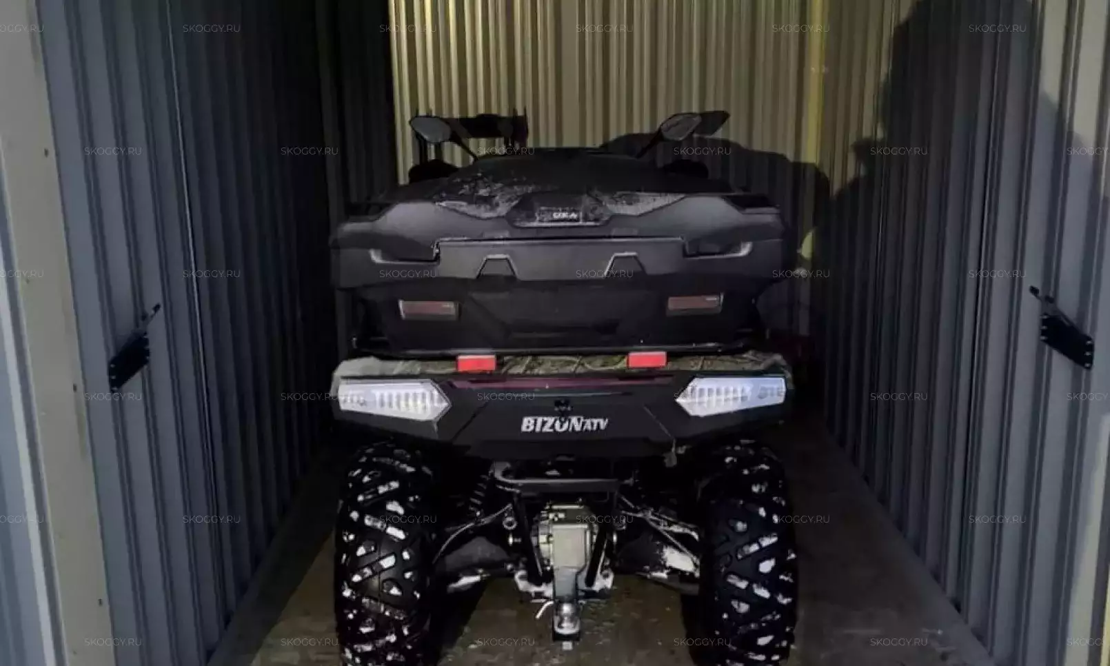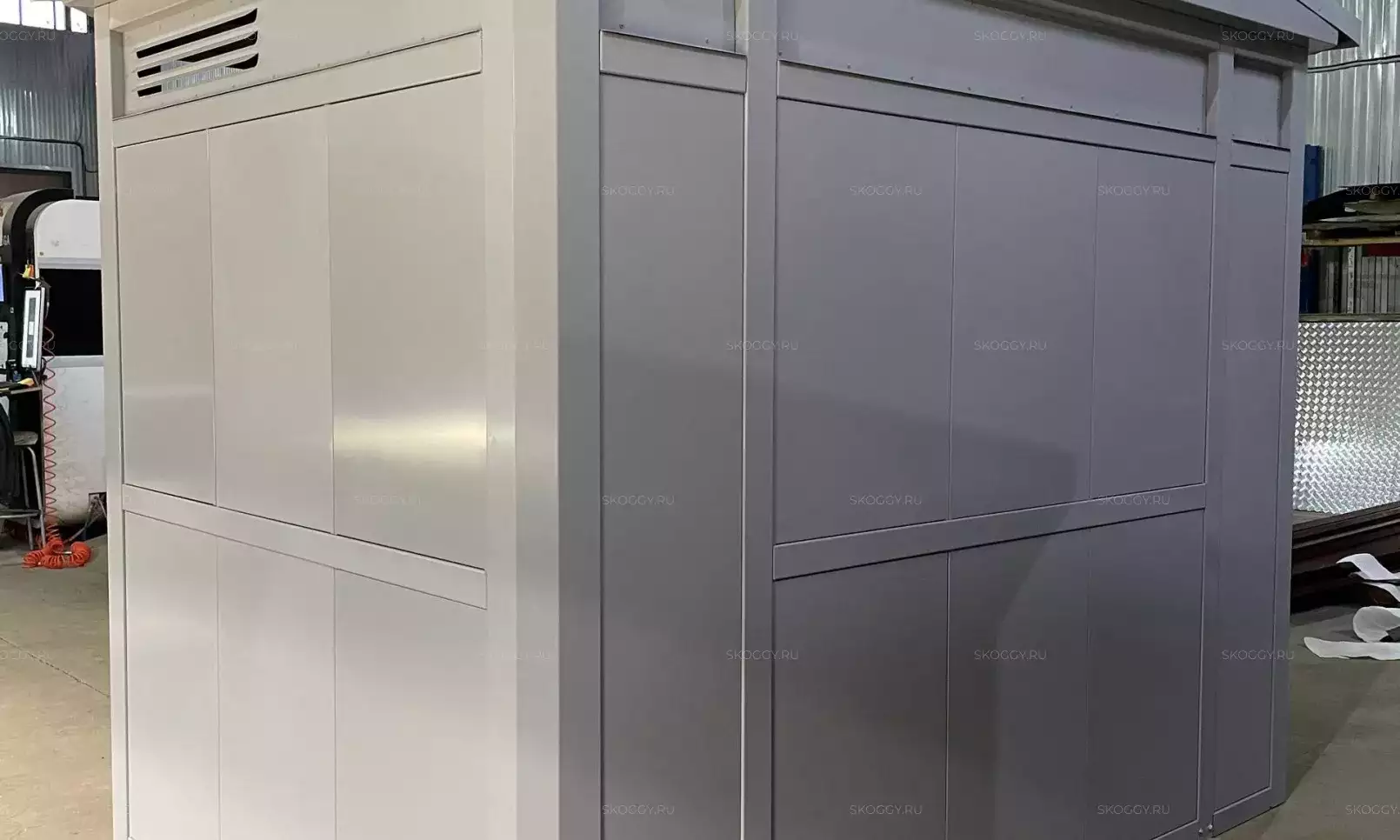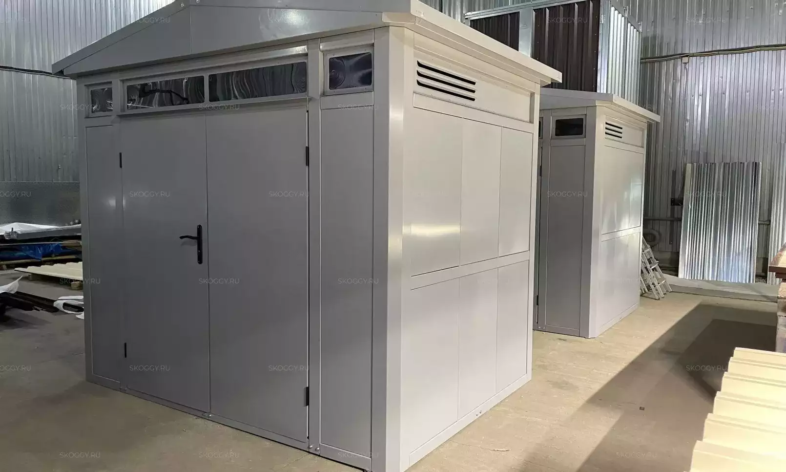 Нами была изготовлена стандартная 4-метровая конструкция с плоской крышей и торцевой воротной группой в неизменно популярном шоколадно-коричневом цвете RAL 8017.