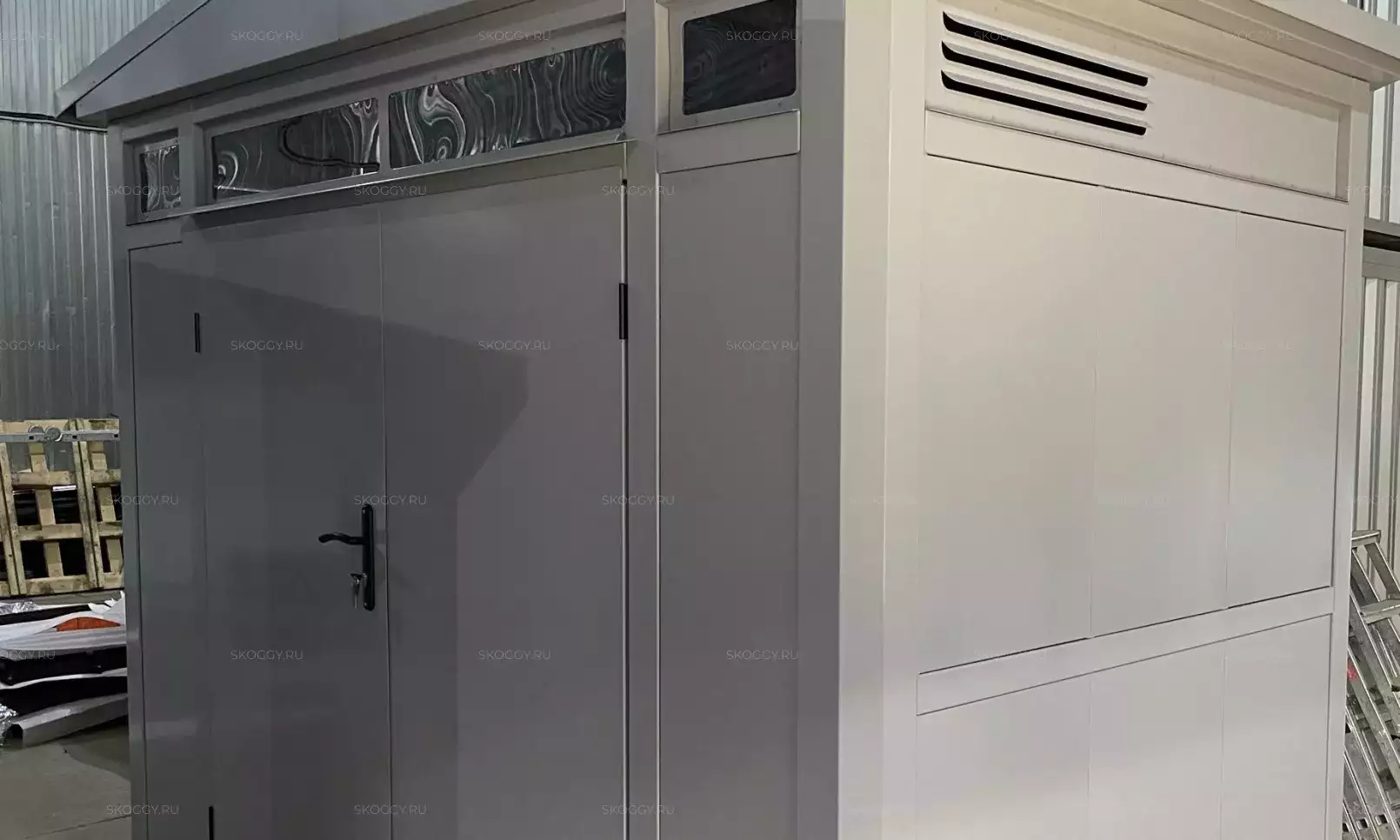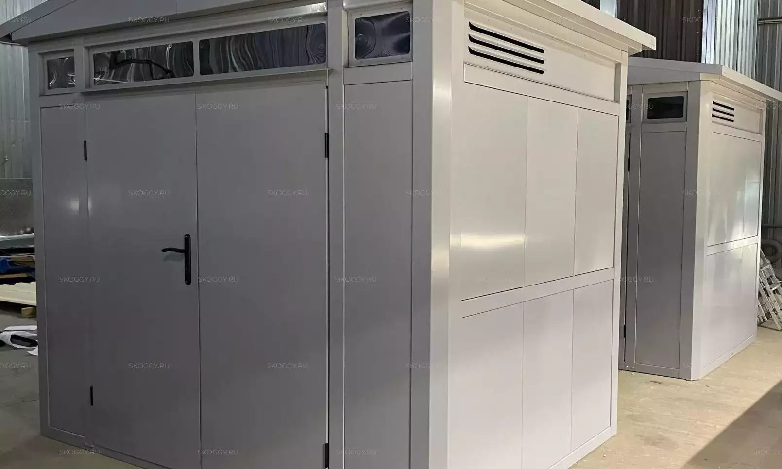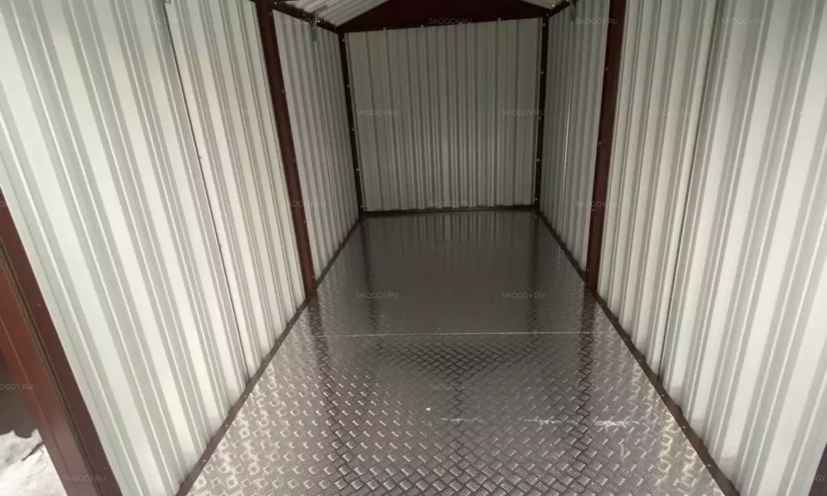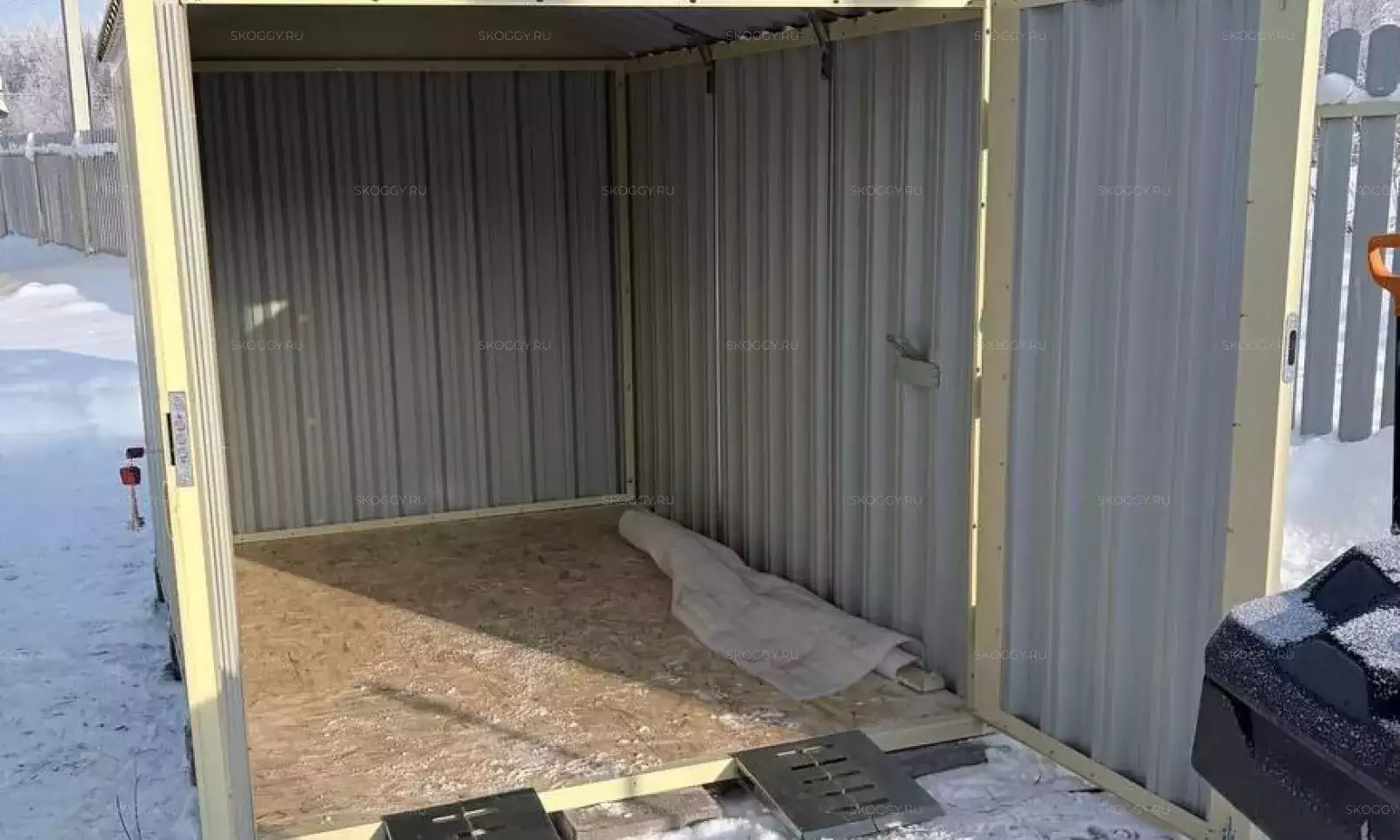 К нам обратился клиент, у которого уже имелся блок-контейнер от компании SKOGGY. Он решил усовершенствовать его и оптимизировать хранение инвентаря с помощью углового стеллажа и специальной системы на направляющих.