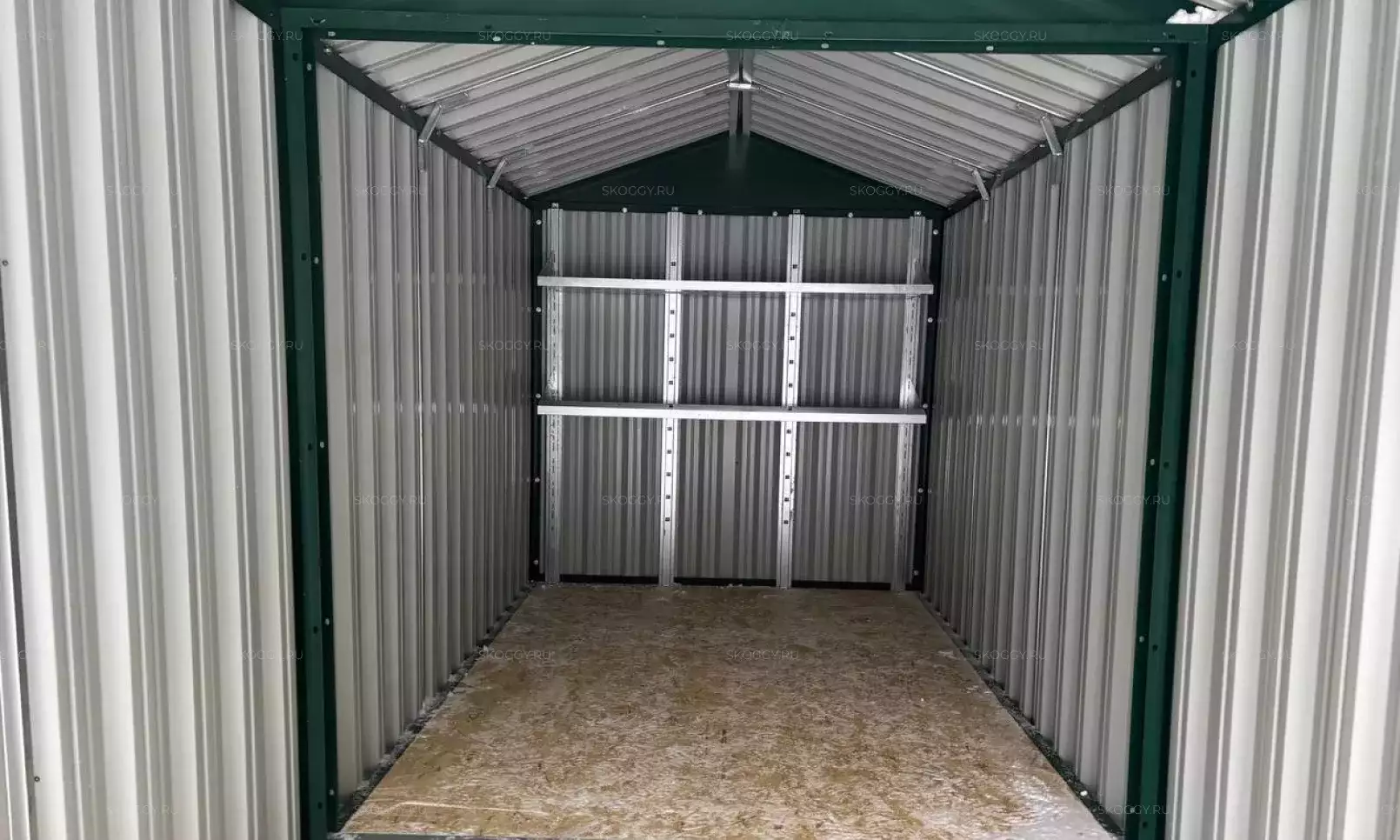 Дополнительно хозблок оборудовали входной дверью шириной 1 м по торцевой стороне, а также установили световое окно 90 х 30 см для проникновения естественного света внутрь постройки.